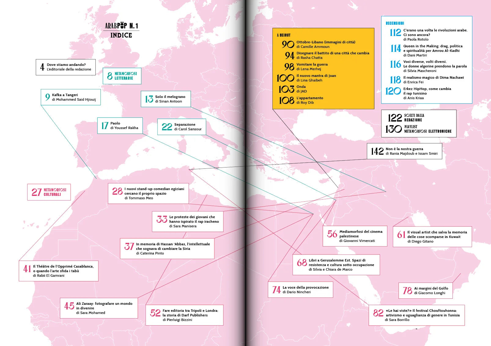 Il primo numero è dedicato al tema della metamorfosi, intesa come trasformazione nel senso più ampio e trasversale possibile: cambiamento ed evoluzione di sensibilità artistiche, rivoluzioni e involuzioni politiche, ma anche mutazioni letterarie, ibridazioni musicali, corpi e identità cangianti. In Arabpop trovano spazio lavori originali di artiste e scrittori arabi, ma anche longform, interviste, traduzioni e alcune rubriche fisse: la playlist a tema, una sezione dedicata al fumetto, una dedicata alle recensioni e, infine, una raccolta di brevi segnalazioni di libri, film e produzioni musicali scelti dalla redazione.