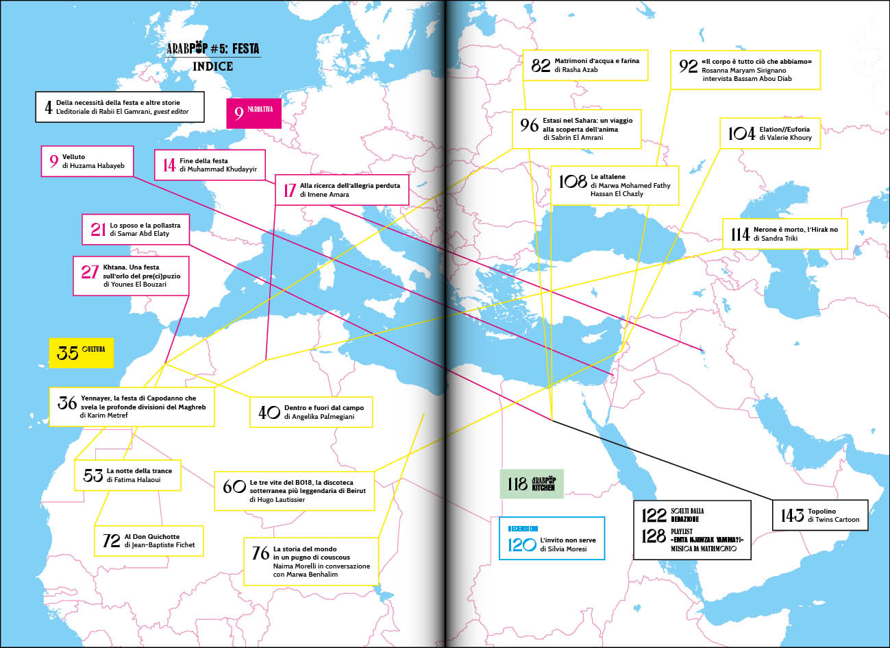 Il quinto numero di Arabpop esplora le molteplici connessioni culturali, letterarie e artistiche, nel mondo arabo, che rimandano al concetto di Festa. Che si tratti di festeggiamenti religiosi o popolari, celebrazioni di riti collettivi o di avvenimenti intimi della vita, commemorazioni storiche o ricorrenze nazionali, manifestazioni artistiche o sportive… nella festa ci si può abbandonare alla gioia, alla leggerezza e alla sensualità, contrapponendo la vita alla morte, la consolazione alla disperazione, esorcizzando il dolore e il male in modalità creative.