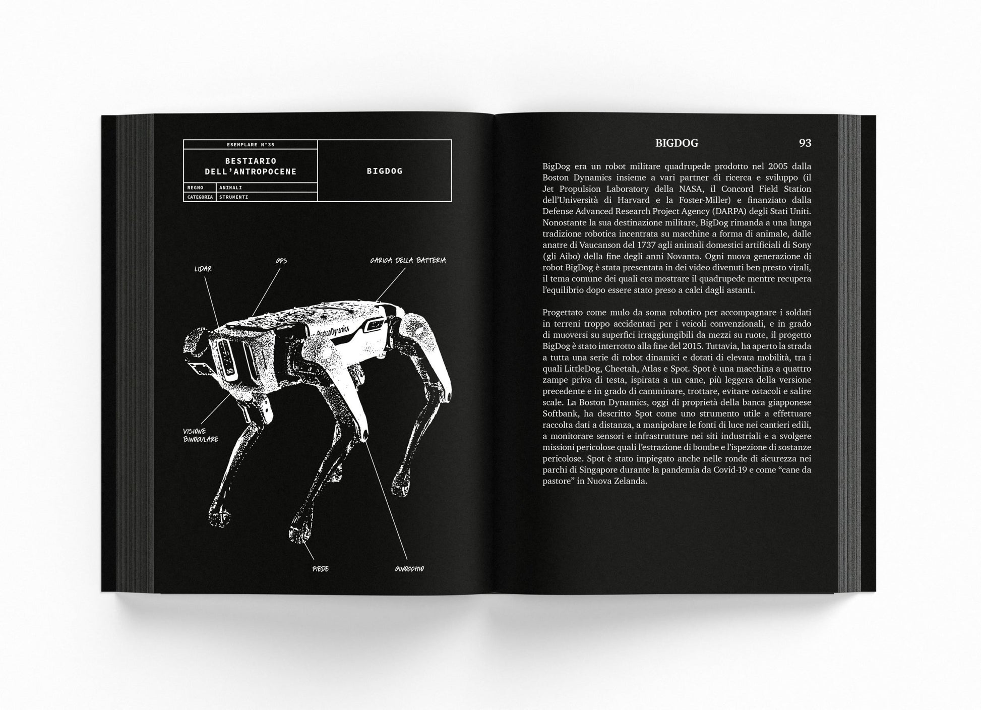 Ispirato tanto ai bestiari medievali quanto all’osservazione del nostro pianeta a pezzi, Bestiario dell’antropocene raccoglie quelle che sono le creature ibride del nostro tempo. Concepito come un manuale pratico, si propone di aiutarci a navigare nella contemporaneità e orientarci nel tessuto sempre più artificiale del mondo. Plastiglomerati, cani robot da sorveglianza, fordite, erba artificiale, alberi antenna, Sars-Covid-2, aquile che combattono con i droni... Tutto questo è sintomatico della rapida trasformazione dell’era “post-naturale” in cui viviamo. Spesso senza che ce ne accorgiamo, queste creature si diffondono esponenzialmente e coesistono con noi.