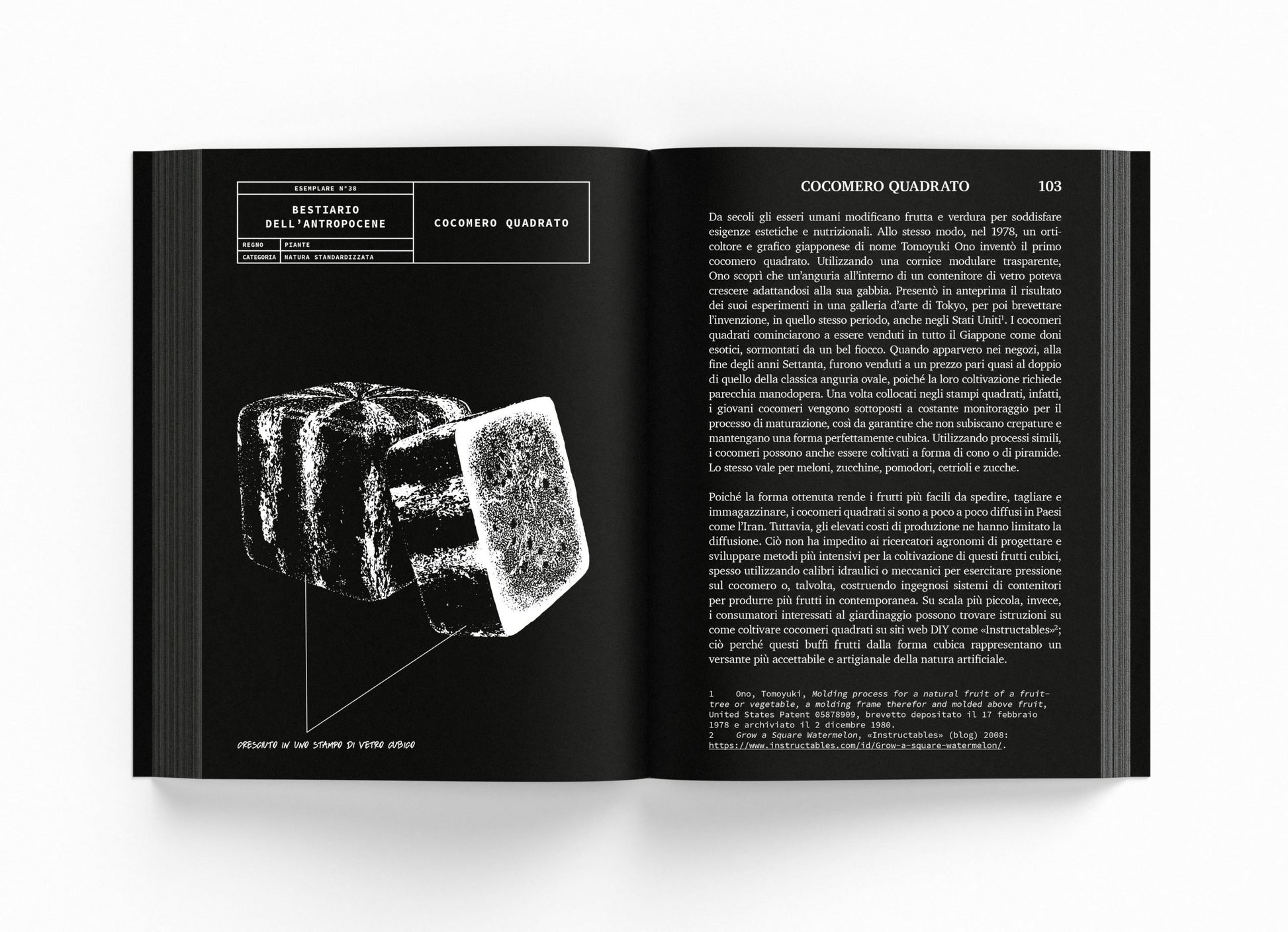 Bestiario dell’antropocene, a cura di Nicolas Nova, cerca di catturare il preciso momento in cui la biosfera e la tecnosfera si fondono e si intrecciano in un nuovo corpo ibrido. Cosa succede quando le tecnologie e le loro conseguenze indesiderate diventano così onnipresenti che è difficile definire cosa sia “naturale” o meno? Cosa significa vivere in un ambiente ibrido fatto di materia organica e sintetica? Quali nuovi esemplari popolano il nostro pianeta all’inizio del XXI secolo?