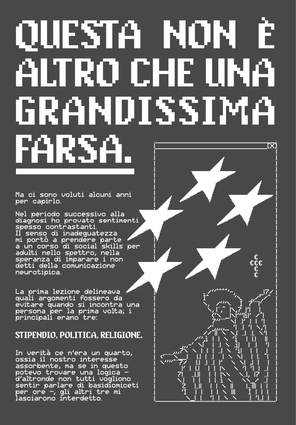 In questo graphic novel, che parte dal dato autobiografico per espandersi a un’invettiva che si fa manifesto, sadagari si e ci interroga su questi nodi centrali della contemporaneità: la neurodivergenza e la disabilità, l’accettazione di sé e dell’altro, il malessere psicologico come condizione socialmente diffusa, spesso ignorata o relegata a una sfera personale da tenere nascosta. Affermare il proprio diritto al malessere diventa un atto rivoluzionario.