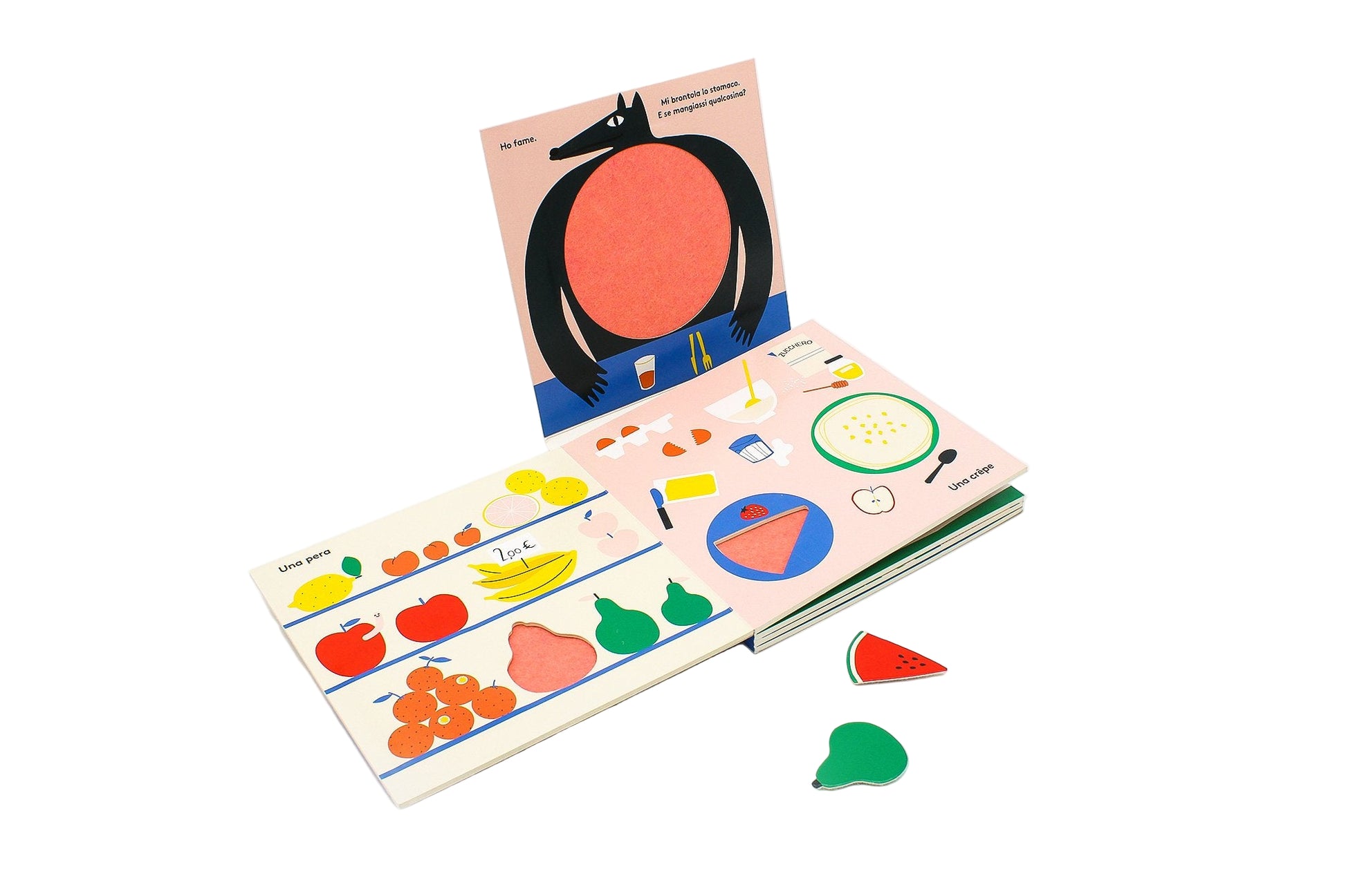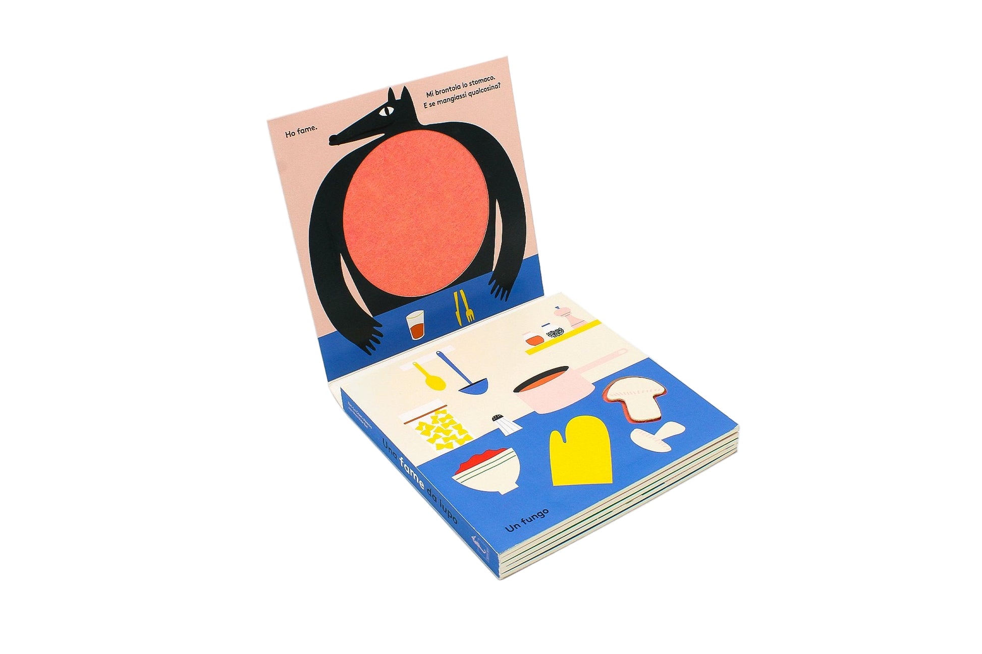 La pancia del lupo brontola perché è vuota. Chi gliela riempie? Sul tavolo in cucina ecco un grande fungo, sulla tovaglia del picnic una fetta d’anguria, nel frigorifero c’è un bel pezzo di gruviera e sul tavolino del salotto una fetta di torta ai mirtilli... Il bambino stacca da ogni pagina qualcosa da mangiare per metterla nella pancia del lupo. Alla fine il lupo, con la pancia bella piena, non ha più fame e… il gioco dello stacca e attacca ricomincia!