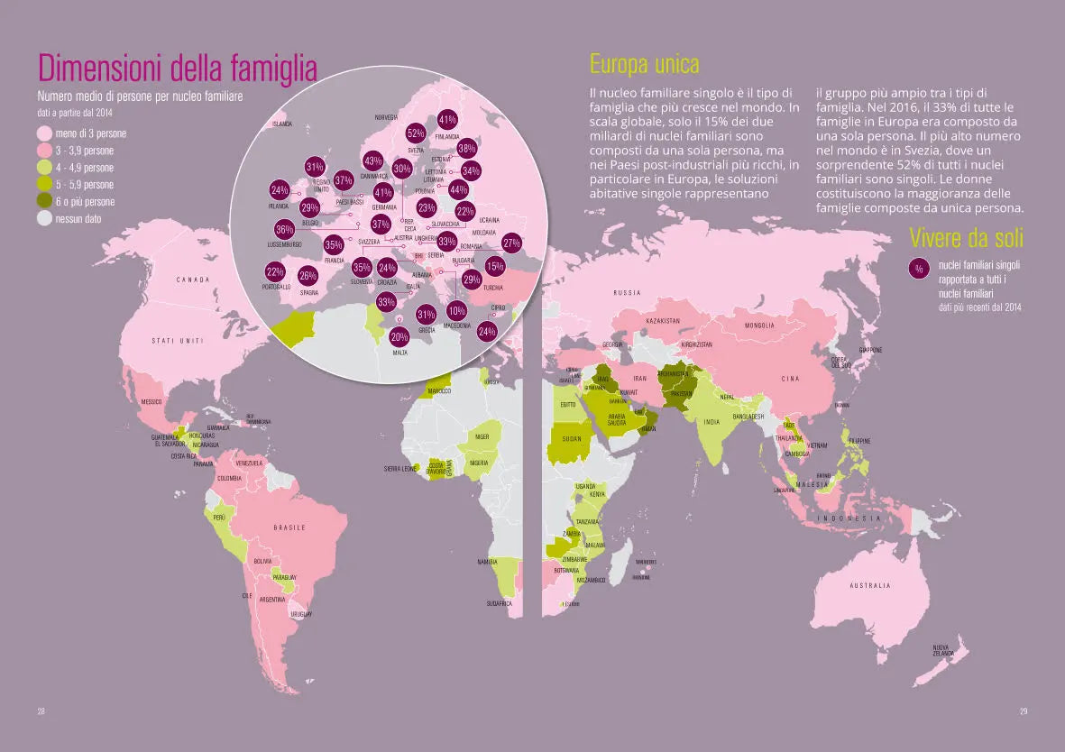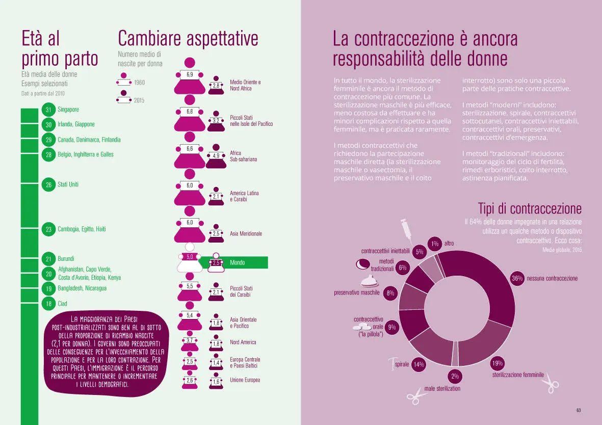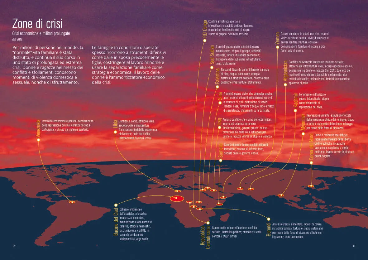 Pagina dopo pagina si scoprono notizie sulle violenze domestiche, sul numero di figli per donna, sull’accesso alla contraccezione, sulla salute femminile, sul mondo del lavoro, sull’istruzione delle ragazze, sull’alfabetizzazione informatica, sulla presenza di donne negli organi di potere… e si incontrano verità sorprendenti come che nel 2018 l’Islanda è stata la prima nazione a rendere illegale il divario retributivo di genere. O che il 40% delle donne sudafricane nella vita subirà una violenza. Che è stato il Ruanda il primo Paese a eleggere un governo a maggioranza femminile. Che, oggi, 520 milioni di donne non sanno leggere.