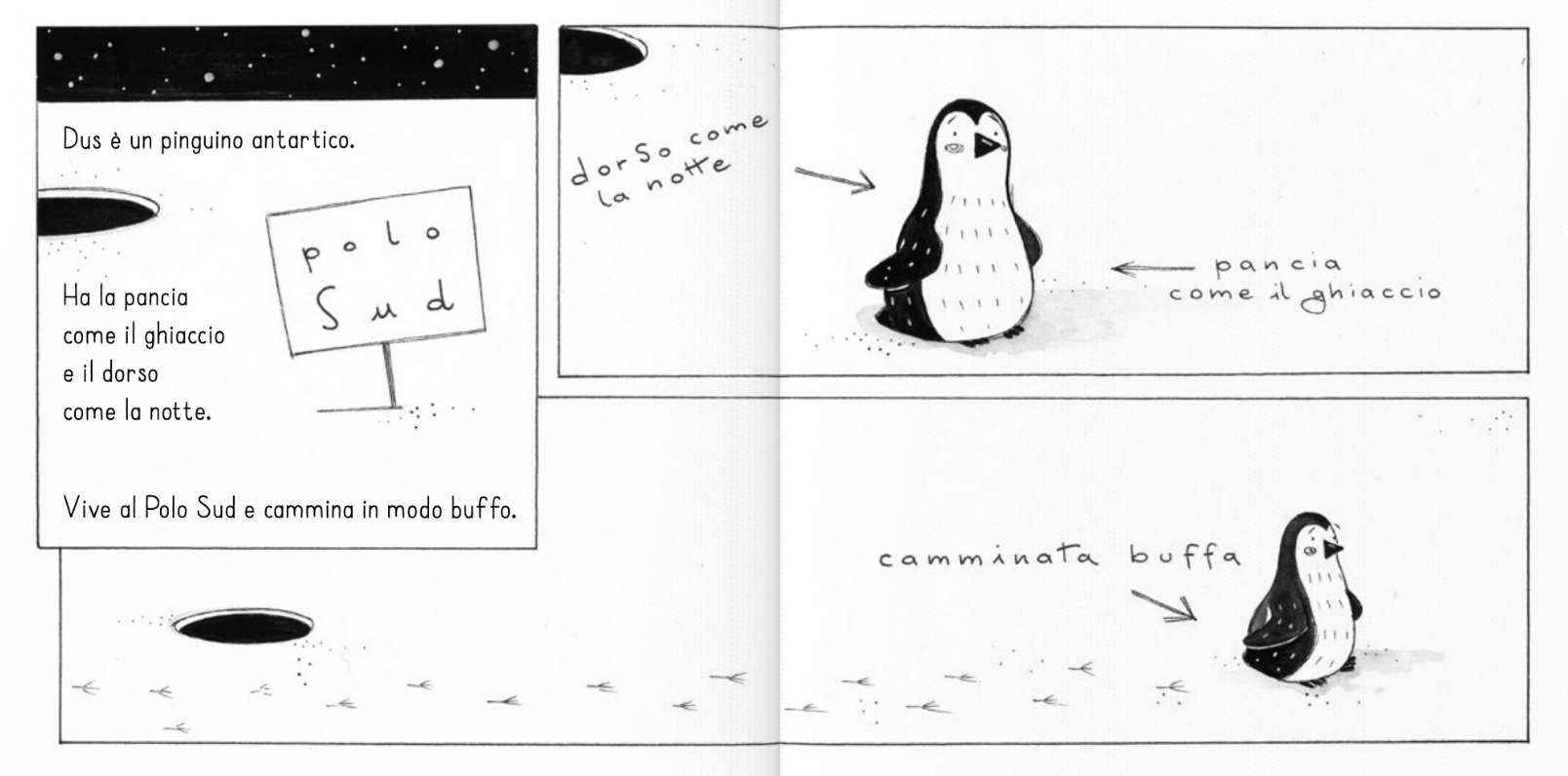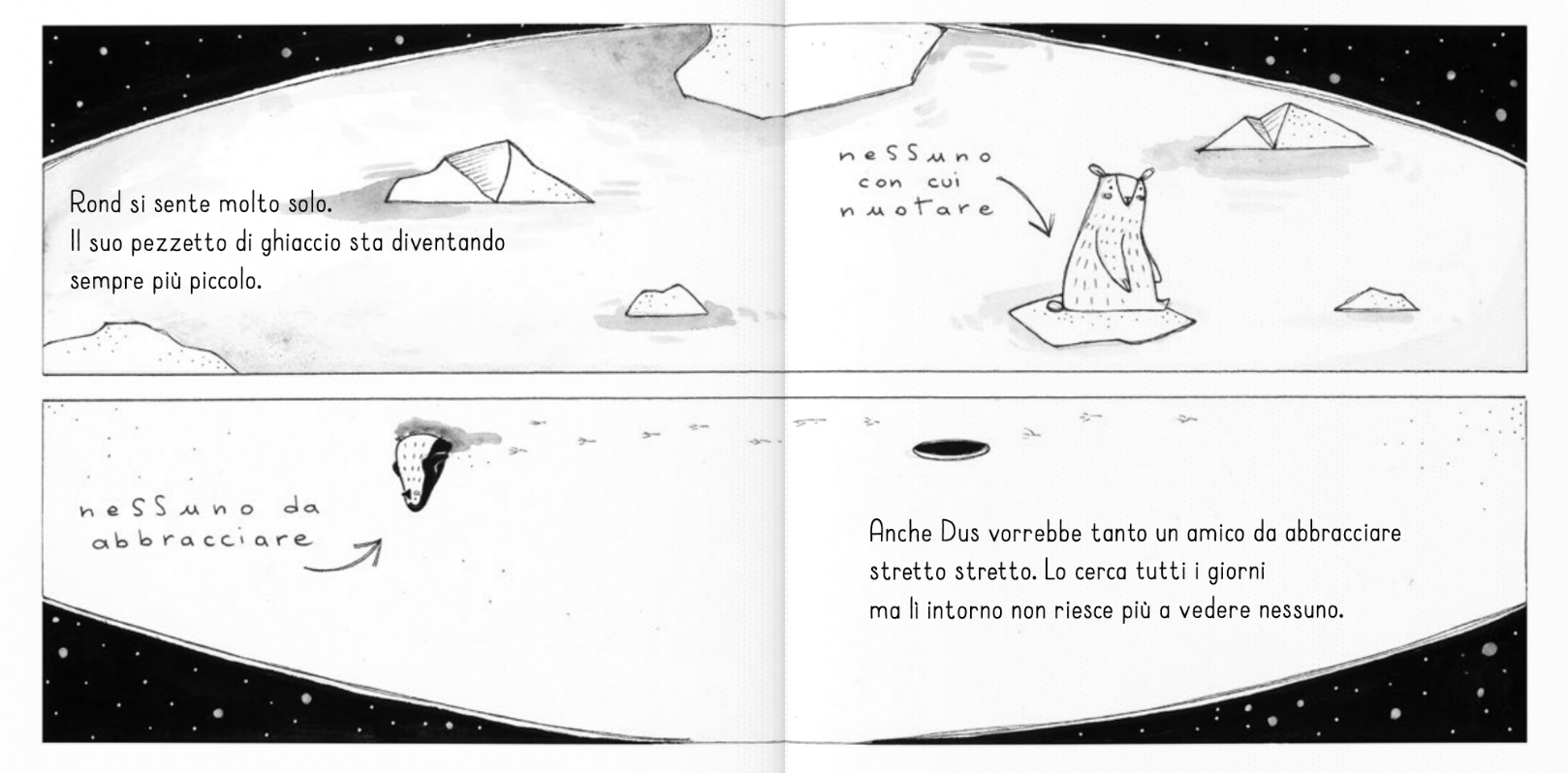 Il testo, semplice e poetico, ricorda come la solitudine possa essere facilmente sconfitta grazie all’amicizia, al gioco e al divertimento. La condivisione di momenti felici con l’altro stimola il bambino ad aprirsi al mondo esterno, evitando chiusure che potrebbero ritardare l’apprendimento e il naturale sviluppo del carattere. Le illustrazioni, dolci e dirette, narrano per immagini le avventure di due simpatici animali molto diversi fra loro (un orso e un pinguino).