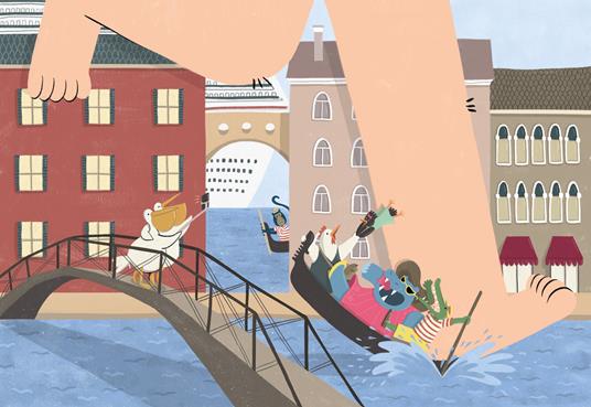 Un po’ strana la vita dei giganti, a pensarci bene. Per loro il mondo è piccolissimo: un passo in qua e sono in America, un passo in là e sono in Australia. Vagano da una terra all’altra, da un continente all’altro in continuazione, lamentandosi di tutto: i numerosissimi ciclisti di Amsterdam, la punta della Tour Eiffel che si infilza sotto ai piedi, l’acqua dei canali di Venezia. Ma forse c’è una soluzione, delle scarpe pensate apposta per loro. Il protagonista di questa storia le prova, poi fa i suoi conti e ci ripensa: che gusto c’è a viaggiare così?